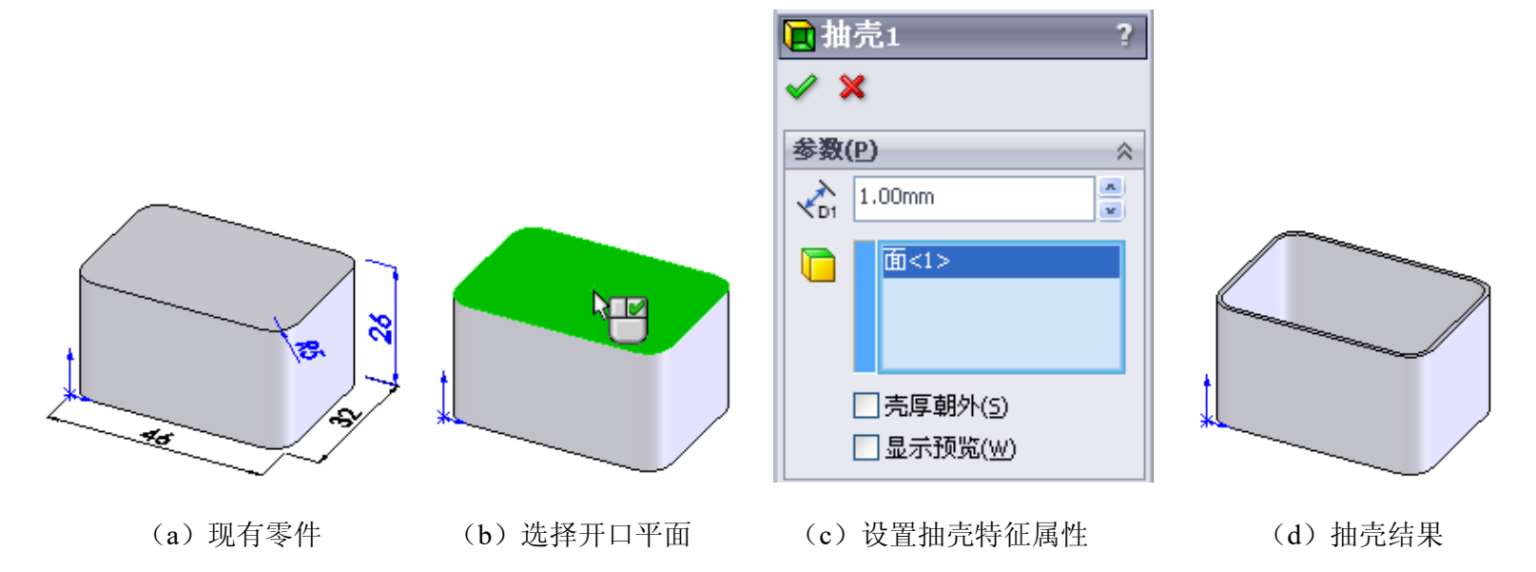 抽壳是敞开所选的面而去除零件内部的材料,并在其他面上生成薄壁的特征造型方法。没有选择任何面时,抽壳一个零件实体会生成一个封闭的、掏空的特征。创建抽壳特征时,首先选择一个或多个开口平面,然后输入薄壁厚度,即可完成抽壳特征的创建。创建抽壳特征过程如图 3-35 所示。