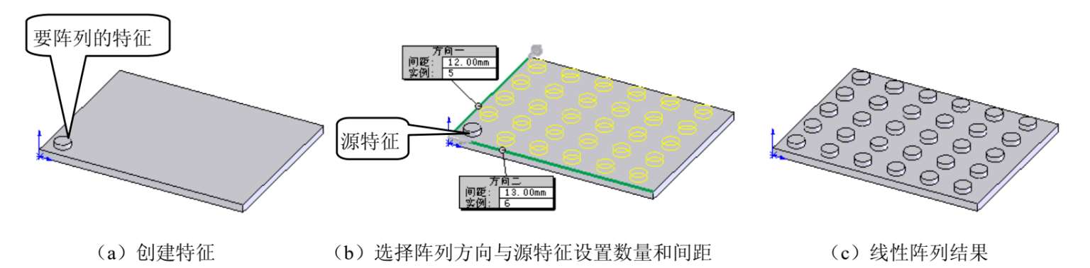 线性阵列是源特征的一维或二维的复制,其创建过程如图 3-37 所示。