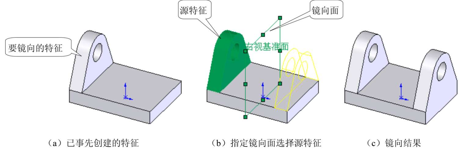 镜向特征以某一平面或基准面为参考面,对称复制选定的特征。如果对源特征进行修改,复制的特征也相同被修改。应用该特征功能可以简化有对称结构的零件造型。其创建过程如图3-45 所示。