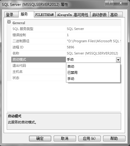 step 2 在如图 4.8 所示的【SQL Server属性】对话框中打开【服务】选项卡,找到【启动模式】选项。单击下三角按钮,在展开的下拉列表框中选择【自动】选项。