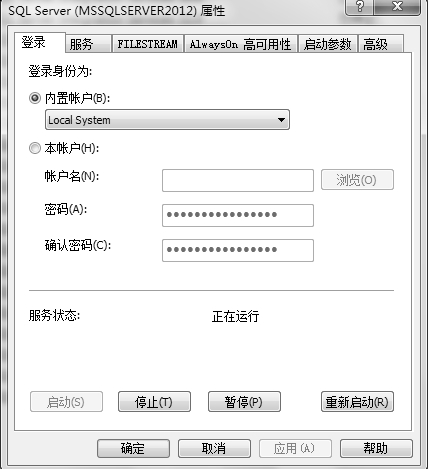 在安装SQL Server 2012 时,安装步骤中有一步是设置登录SQL Server 2012 时使用的账户,不清楚的读者可以查看第 2 章图 2.28 所示的界面。在安装完SQL Server 2012 之后,还可以重新设置这个登录账号。下面以修改【SQL Server】服务为例,介绍设置方法。