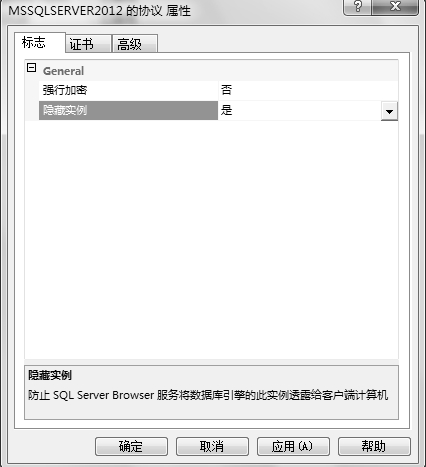 step 3 在图 4.18 所示的【MSSQLSERVER2012 的协议属性】对话框中,将【隐藏实例】选项设置为【是】。