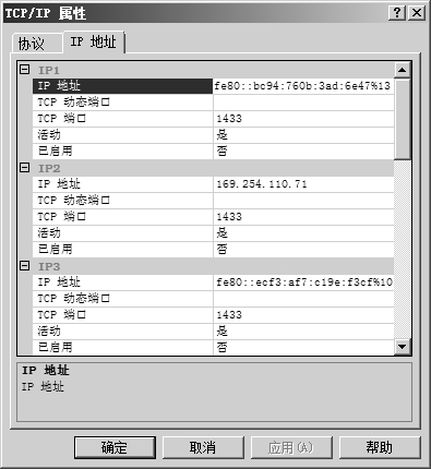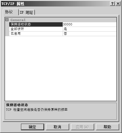 ◆ 【全部侦听】: 指定SQL Server是否侦听所有绑定到计算机网卡的IP地址。在服务器上,有可能给一个网卡指定多个IP,例如一个内网IP,一个外网IP。如果设置为【否】,则需使用每个IP地址各自的属性对话框对各个IP地址进行配置。