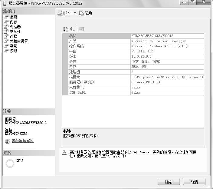 如图 4.19 所示的是服务器属性的【常规】选项页,此处功能是查看服务器的属性,例如服务器名、操作系统和CPU数等。此处各项只能查看,不能修改。选项页中有以下项目。