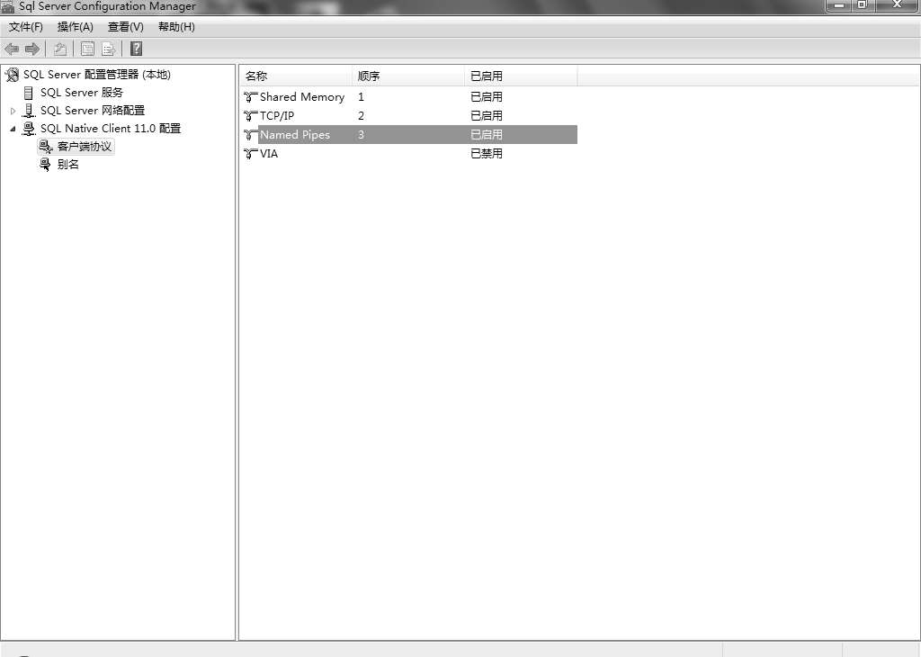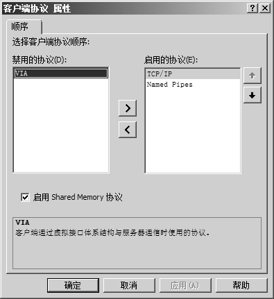 如果启用了共享内存协议,SQL Server会自动把它设置为首选项。建议使用顺序为:共享内存、TCP/IP、管道。