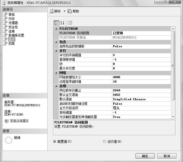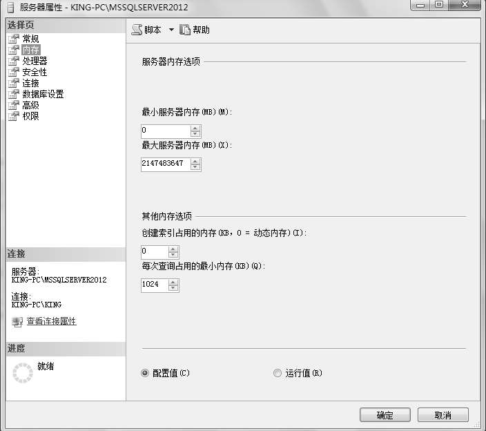 服务与服务器是两个不同的概念,服务器是提供服务的计算机,配置服务器主要是对内存、处理器和安全性等几个方面进行操作。由于SQL Server 2012 服务器的设置参数比较多,这里选一些比较常用的进行介绍。