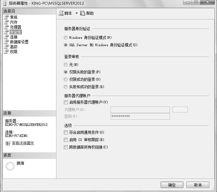◆ 服务器身份验证: 用于更改SQL Server 2012 服务器的身份验证方式,与安装SQL Server 2012 时的选项相同,提供Windows身份验证模式和混合模式(SQL Server和Windows身份验证模式)两种。