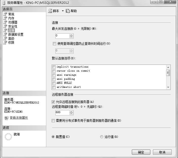 ◆ 最大并发连接数: 默认值为 0,表示无限制,也可以输入数字来限制SQL Server 2012 允许的连接数。