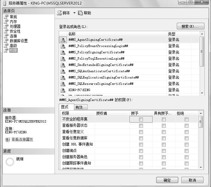 如图 4.26 所示为服务器属性的【权限】选项页,该选项页用于授予或撤销账户对服务器的操作权限。
