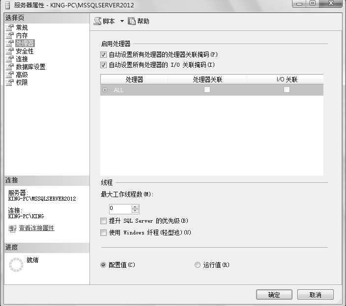 ◆ 自动设置所有处理器的I/O关联掩码: 此项用于设置是否允许SQL Server设置I/O关联。如果启用,操作系统将自动为SQL Server 2012 分配磁盘控制器。