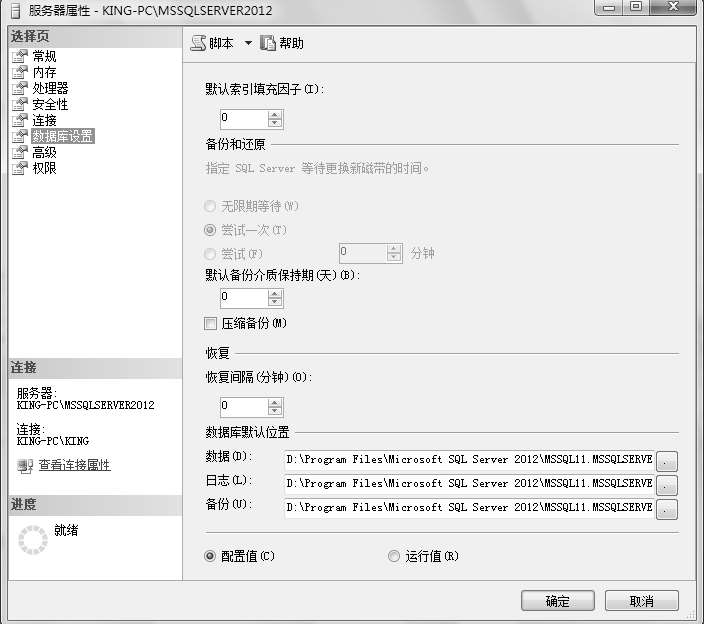 如图 4.24 所示为服务器属性的【数据库设置】选项页,其中有以下项目。