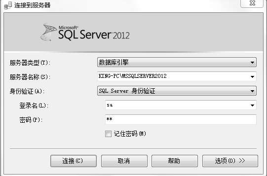在SQL Server 2012 中,可以把不同类型的数据库服务器安装在不同的计算机上。所以在输入服务器名称时,要先确定它是不是这个服务器类型的数据库服务器。如果出现下拉列表框让用户选择,SQL Server 2012 会自动判断。