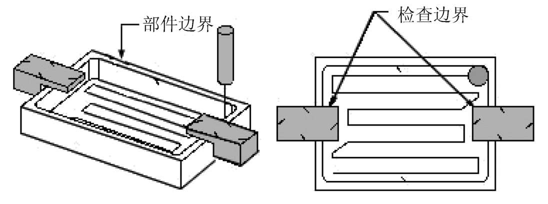 ● 指定检查边界:指定代表加工时要避开的夹具或其他区域的边界。除了指定的部件几何体(不论部件几何体是由边界定义的,还是由曲面区域、体、面或曲线定义的)之外,还使用检查边界来定义刀具必须避开的区域。总是在要避让的几何体的顶部定义检查边界。NX通过从边界平面向下投影边界来确定要避让的材料体积。如图 3-36 所示,检查边界定义平面铣操作中的固定夹具。