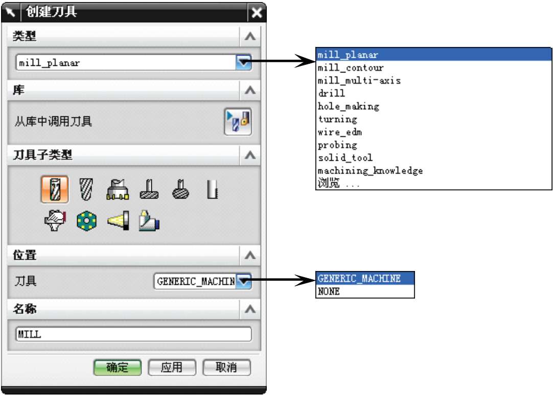 ● 刀具:在【刀具】下拉列表框中选择刀具对象的父组对象。若选择GENERIC_MACHINE,将在CAM默认的刀具组中创建刀具新对象。若选择NONE,新建的刀具对象将显示在机床视图中的“未用项”文件夹中。