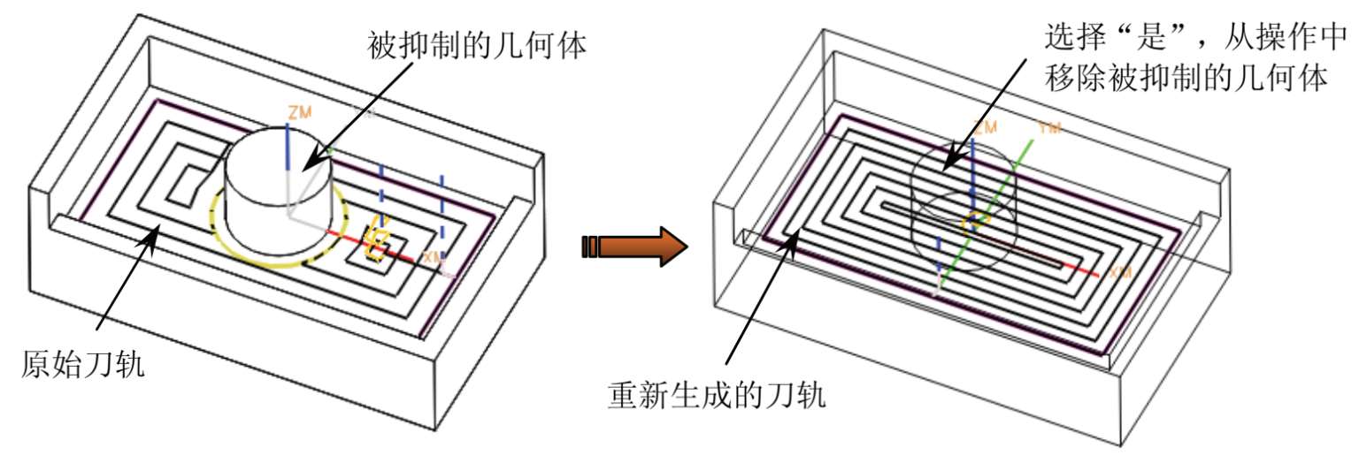 在【被抑制几何体】信息对话框中选择“是”,将只从操作中移除被抑制的几何体,然后继续编辑或生成该操作。选择“否”将把被抑制的几何体保留在操作中。释放操作可以重新显示该几何体,但不能把它添加回操作中。必须将被释放的几何体重新指定为部件、毛坯、检查、驱动或避让几何体,这样才能重新识别它,如图 3-17 所示。
