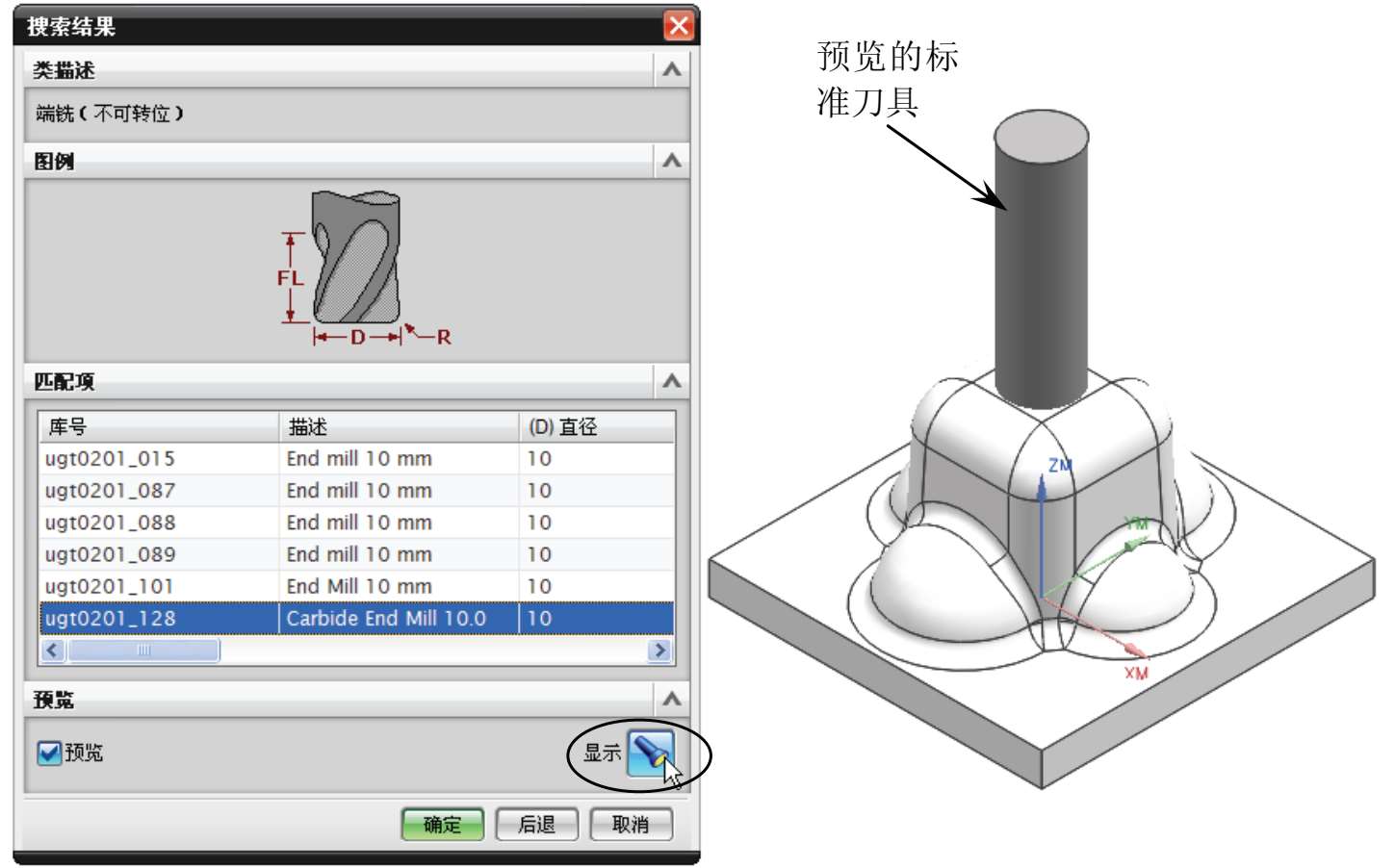 在【搜索结果】对话框的【匹配项】列表中选择要添加的标准刀具,然后在【预览】选项区勾选【预览】复选框,再单击【显示】按钮