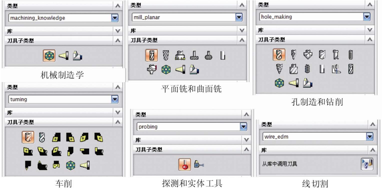 【创建刀具】对话框中显示的刀具类型由指定的“CAM设置”(模板部件文件)决定。如图 3-25 所示为各加工类型的刀具。