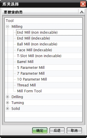 ,弹出【库类选择】对话框,如图3-22 所示。该对话框包括有铣刀、钻刀、车刀和实体刀具 4 种类型的标准刀具。