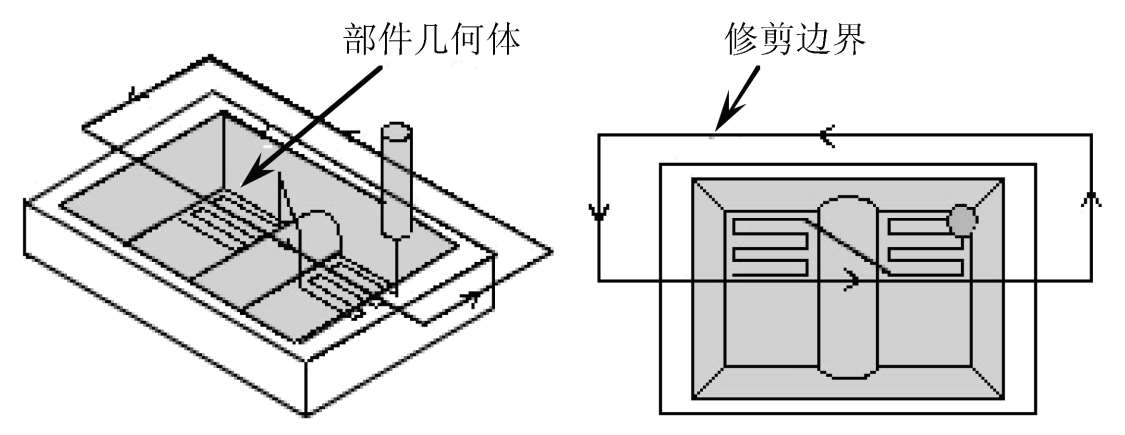 ● 指定修剪边界:指定边界以定义操作期间要从切削部分中排除的区域。修剪边界与指定的部件几何体结合使用,用来去掉或修剪掉一部分切削区域。如图 3-37 所示,修剪边界修剪掉了型腔铣操作中修剪边界外的所有切削区域。