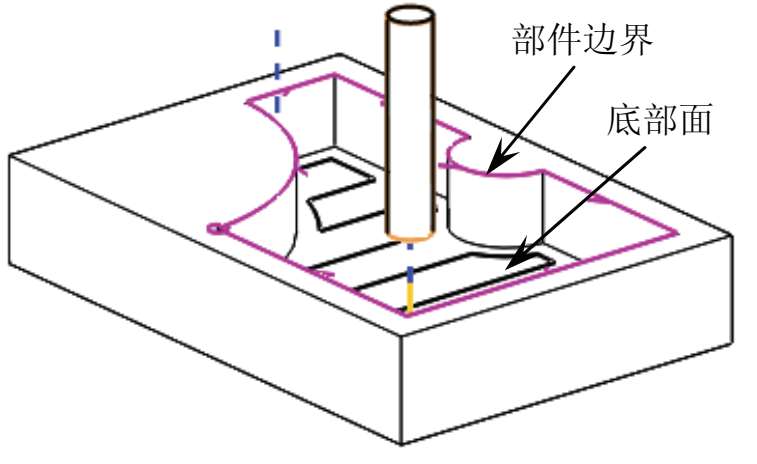 ● 指定部件边界:指定代表加工后的部件的几何体。如图 3-34 所示说明了边界最常见的一种用途。平面铣操作中的单个部件边界定义要从中移除材料的切削体积。该部件边界包含切削部件时的刀具,底部面定义切削深度。