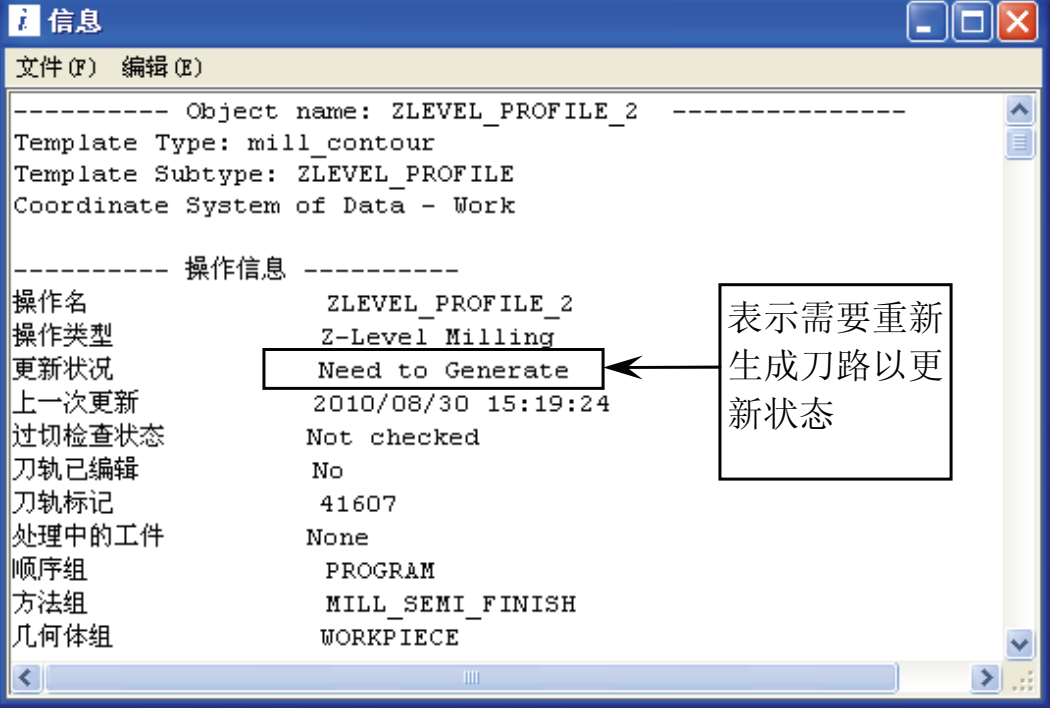 在操作导航器中,选择出现状态符的操作,然后执行右键快捷菜单中的【信息】命令,在打开的【信息】窗口查看改变了什么而导致此状态,如图 3-19 所示。