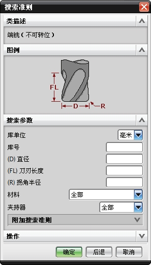 在其中一种刀具类型中选择标准刀具分类型,然后单击【确定】按钮,将弹出【搜索准则】对话框,如图 3-23 所示。