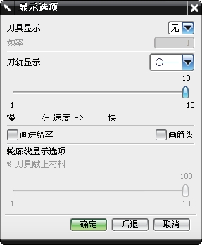 ● 编辑显示:在【平面/型腔铣】、【固定/可变轮廓】及【点到点】对话框的底部选择【编辑显示】按钮后,出现【显示选项】对话框,如图 3-45 所示。通过该对话框,可以显示刀具和刀轨、文本和颜色表示的进给率、将显示在CLSF中的行号,以及刀具移动的方向,还可以控制屏幕上的显示速度。