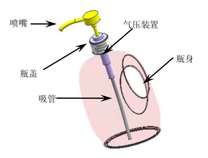 本节将以一个较为典型的案例来说明UG产品造型设计的一般流程。沐浴露瓶是一个小型气压装置,从结构上看,沐浴露瓶由瓶身和瓶嘴构成,瓶身仅有一个组成部件,瓶嘴则由喷嘴、气压装置、瓶盖等部件组成,如图1-43所示。