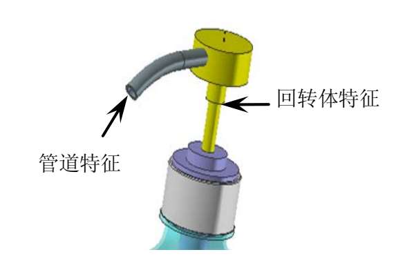 沐浴露瓶结构中除以上为曲面建模外,其余特征建模均为实体建模。如瓶嘴的实体建模,包括“回转体”、“管道”和“扫掠体”,如图1-50所示。
