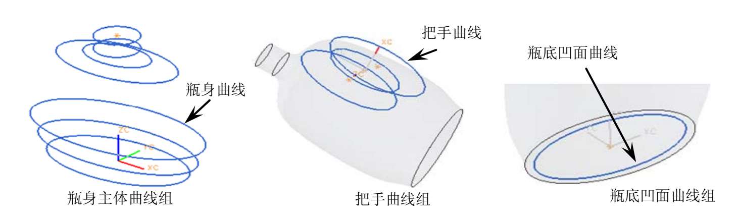 沐浴露瓶身是自由曲面造型设计的结果。由曲线可以构建曲面,使用UG建模模块中【曲线】工具条上的【椭圆】工具来创建的瓶身主体曲线。同样,把手的形状特征和瓶底凹形面也是利用【椭圆】工具来构建其曲线的,如图1-48所示。