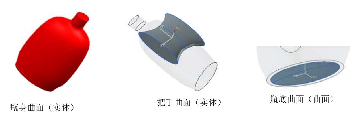 由于构建曲面的曲线是封闭曲线,因此所构建的特征实际上是实体。若构建曲面的曲线是开放式的,则最终生成的特征只能是曲面特征。例如,瓶身主体曲线和把手曲线是封闭式曲线,则生成的特征是实体,而瓶底曲线在构建曲面时需要一分为二,实际上就变成了开放式曲线,由此构建的特征就是曲面。
