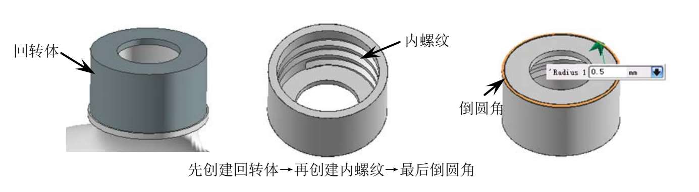 瓶盖结构比较简单,先创建一个回转体特征,然后在回转体内表面创建内螺纹特征,最后进行倒圆角处理,如图1-46所示。