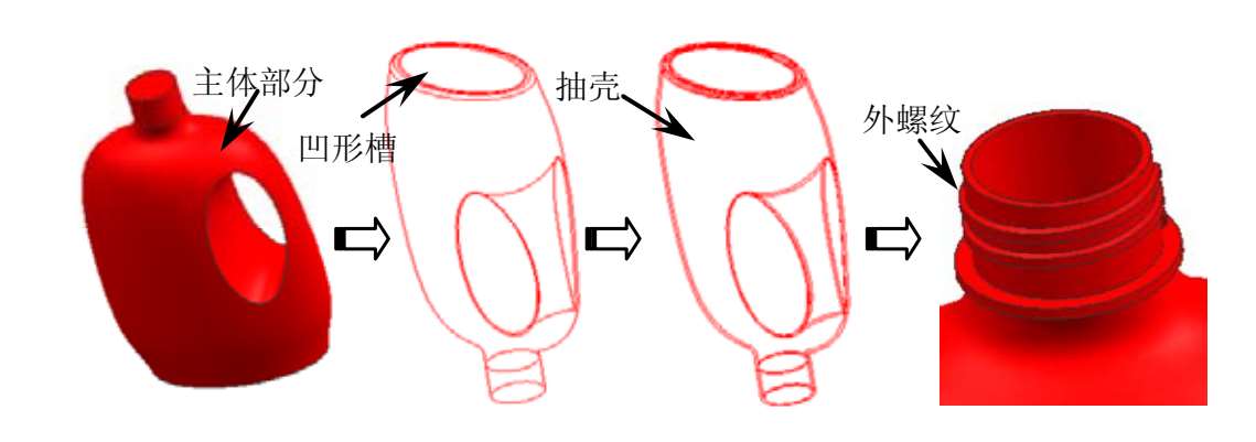 瓶身的设计思路是:先创建出主体部分→然后创建底部凹形槽→再进行抽壳→最后创建瓶口的外螺纹特征,如图1-47所示。