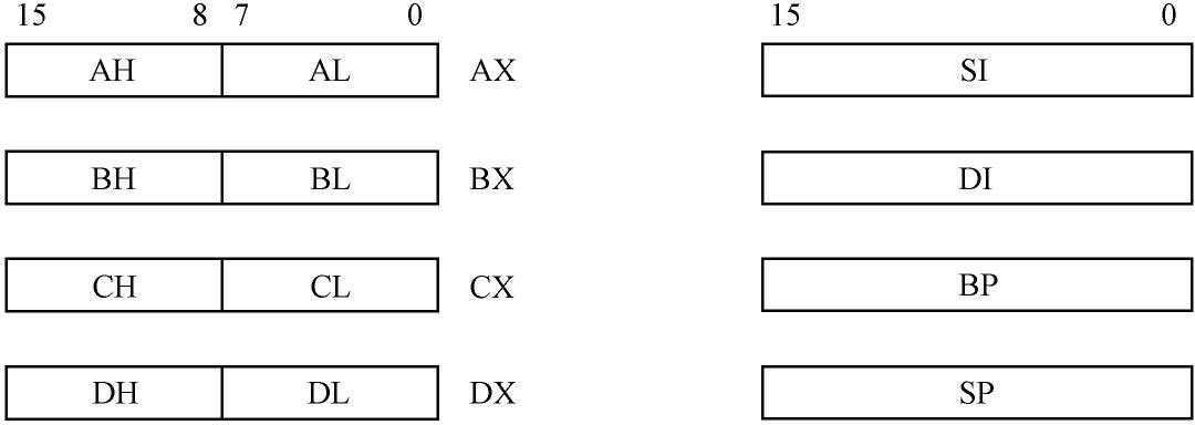 如图2-7 所示,因为这8 个寄存器都是16 位的,所以通常用于进行16 位的操作。比如,可以在这8 个寄存器之间互相传送数据,它们之间也可以进行算术逻辑运算;也可以在它们和内存单元之间进行16 位的数据传送或者算术逻辑运算。