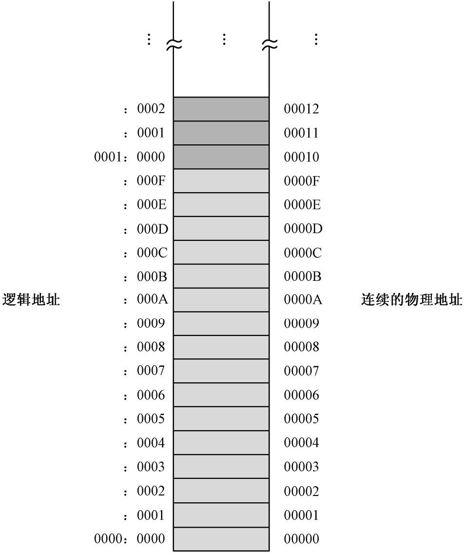 在前面的例子中,所有在执行时需要访问内存单元的指令,使用的都是真实的内存地址。比如A1 00 01,这条指令的意思是从地址为0100H 的内存单元里取出一个字,并传送到寄存器AX。在这里,0100H 是一个真实的内存地址,又称物理地址。