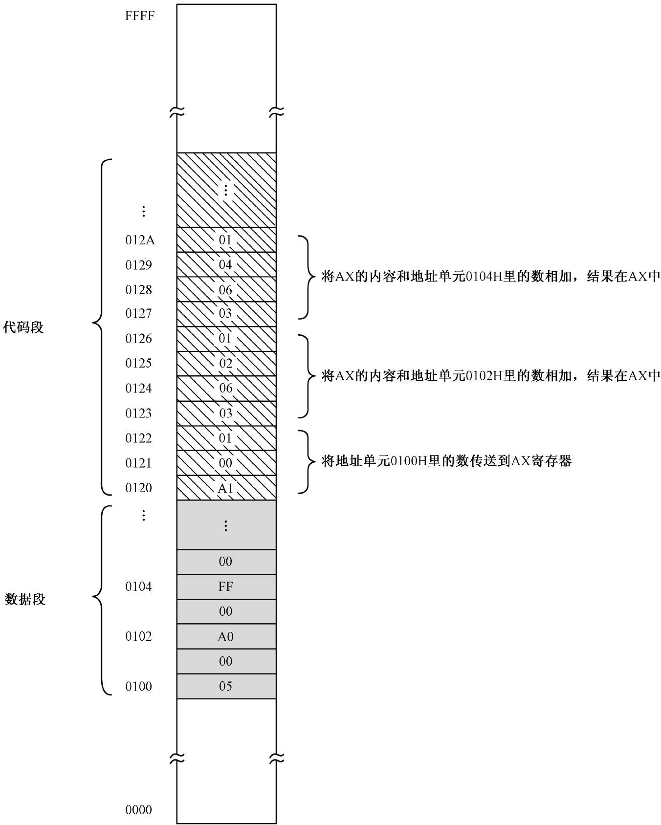 代码段是从内存地址0120H 处开始的,第一条指令是A1 00 01,其功能是将内存单元0100H里的字传送到AX 寄存器。指令执行后,AX 的内容为0005H。