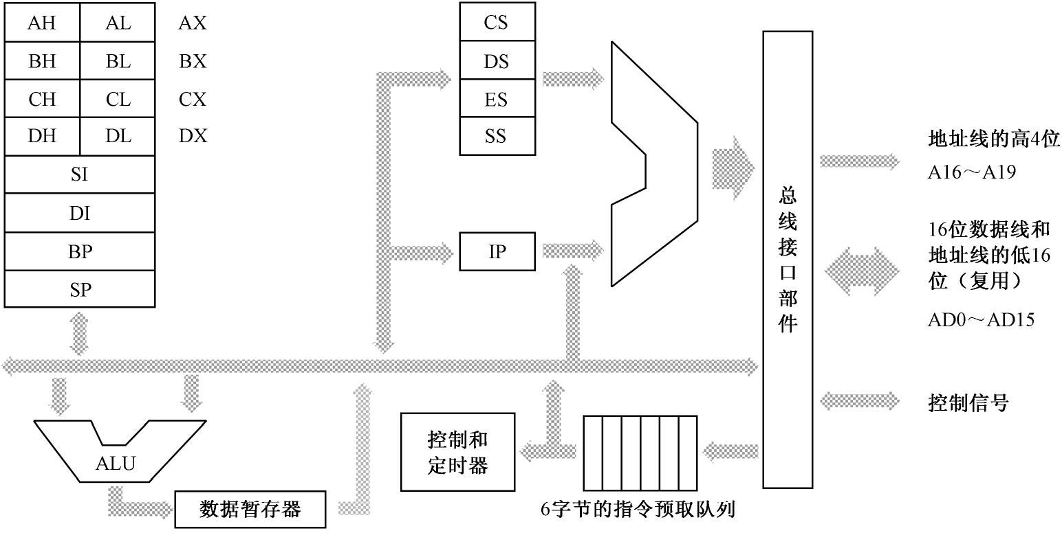 在进行数据传送或者算术逻辑运算的时候,使用算术逻辑部件(ALU)。比如,将AX 的内容和CX 的内容相加,结果仍在AX 中,那么,在相加的结果返回到AX 之前,需要通过一个叫数据暂存器的寄存器中转。