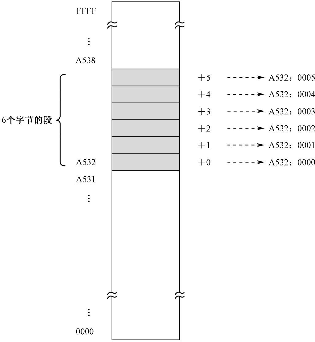 这个分段包含了6 个存储单元。在分段之前,它们在整个内存空间里的物理地址分别是A532H、A533H、A534H、A535H、A536H、A537H。