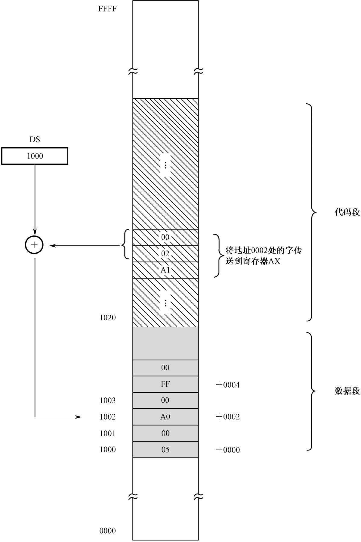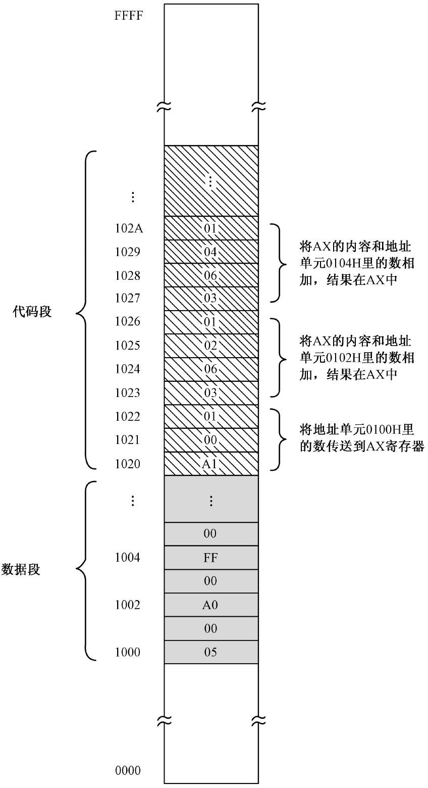 如图2-11 所示,代码段的段地址为1020H,数据段的段地址为1000H。在代码段中有一条指令A1 02 00,它的功能是将地址0002H 处的一个字传送到寄存器AX。在这里,处理器将0002H 看成是段内的偏移地址,段地址在DS 中,应该在执行这条指令之前就已经用别的指令传送到DS 中了。