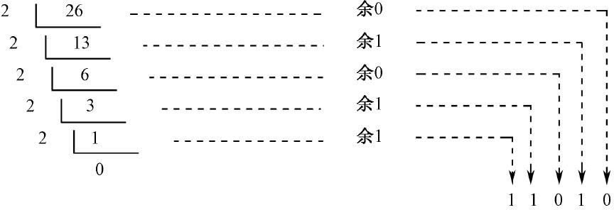 为了将一个十进制数转换成二进制数,可以采用将它不停地除以二进制的基数2,直到商为0,然后将每一步得到的余数串起来即可。如图1-2 所示,如果要将十进制数26 转换成二进制数11010,那么可采用如下方法: