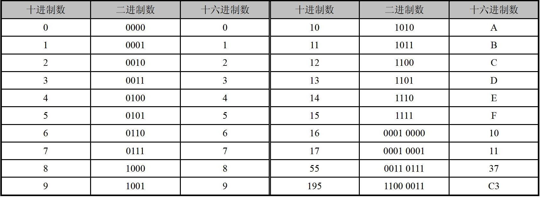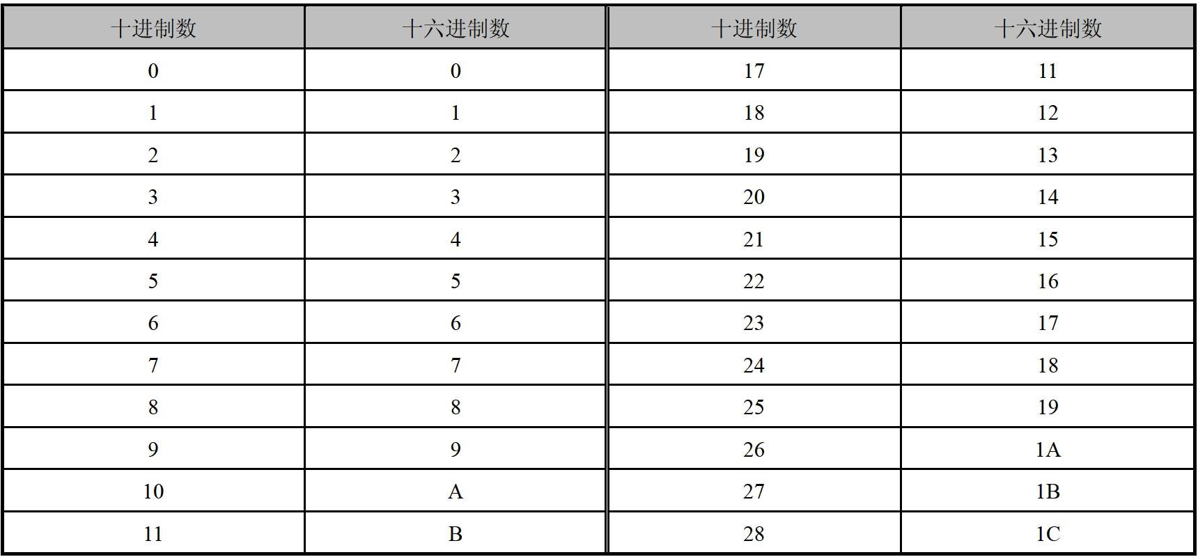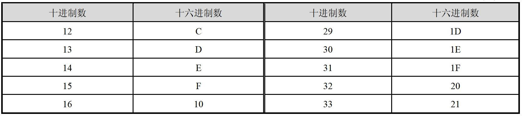 表1-2 部分十进制数、二进制数和十六进制数对照表