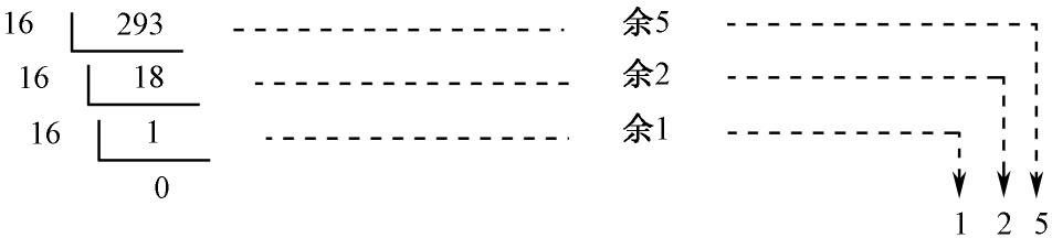 如图1-3 所示,相应地,要把一个十进制数转换成十六进制数,则可以采取不停地除以16 并取其余数的策略。