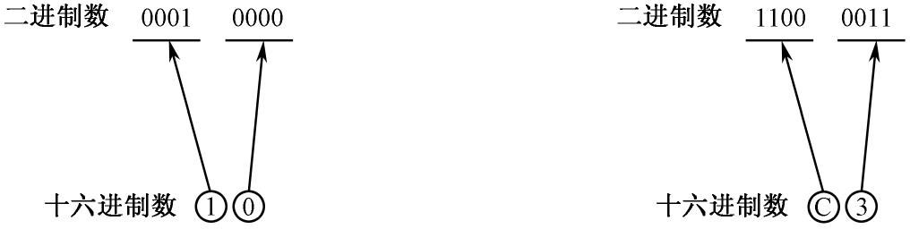 再比如图1-4(右边)中的二进制数1100 0011,它与等值的十六进制数C3 也有着相同的对应关系。