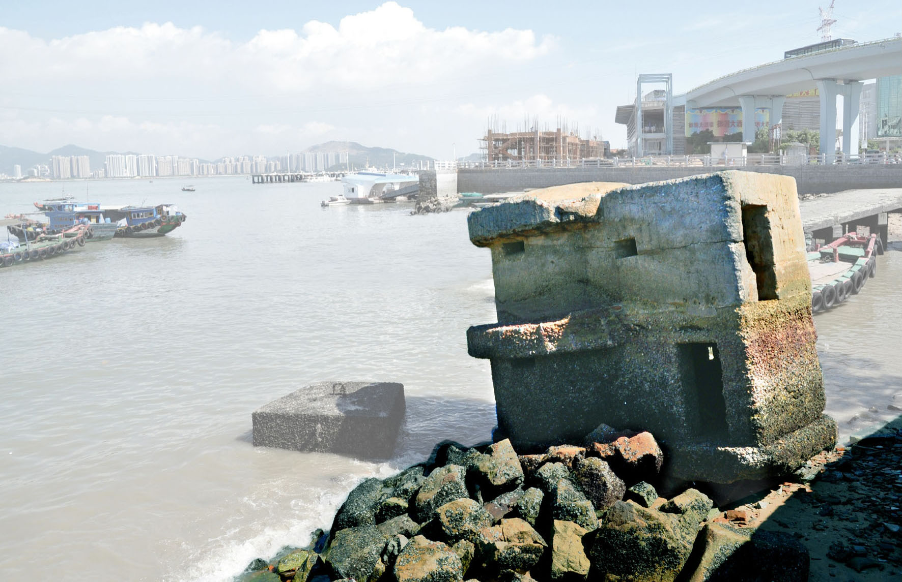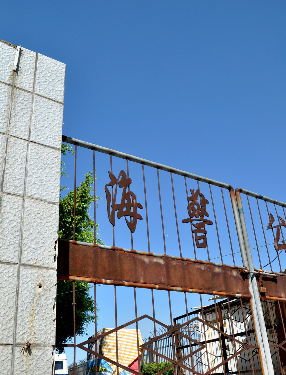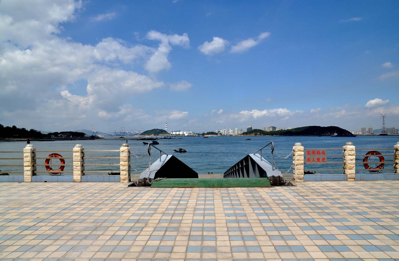 1931年,由原典宝路头填海延伸,建成水泥踏步式码头,可靠泊15吨船舶的码头,按地理位置排序为“第四码头”。如今,焊着“海警公安”四个大字的铁门,锈迹斑斑地立在马路旁,一看就知道已废弃多年。离这后面50米,有一个瓷砖铺就的新码头,视野开阔,钢质引桥连接趸船泛着灰色防护漆的油光,“军用码头,闲人免进”的警示牌在阳光下熠熠生辉。