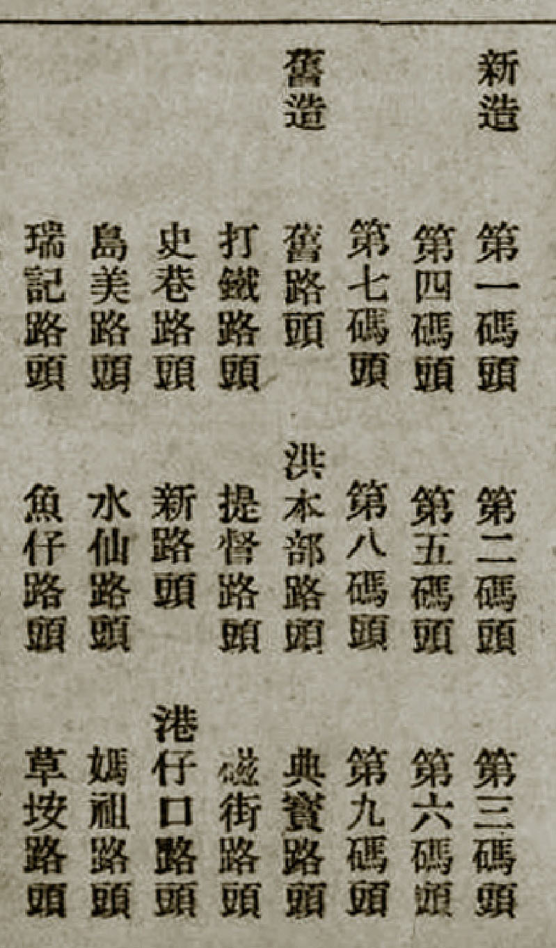 1929至1932年,厦门市政当局修建的新码头,不再沿用“路头”的叫法,一些初具近代形态的码头,从北向南依次出现在鹭江道的堤岸,码头以所在地理位置,按顺序用数字命名。共和国成立后,部分码头按功能命名,还有一部分仍沿用了早期的名称。