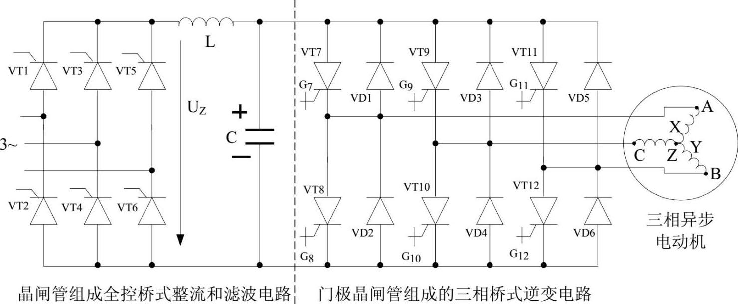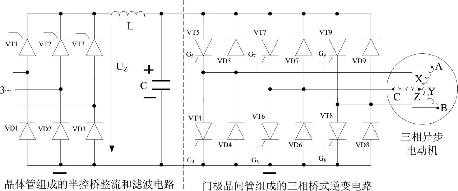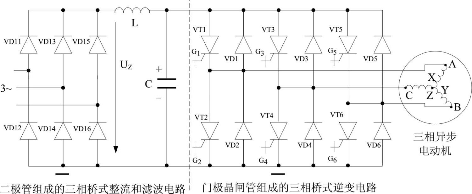 通过以上分析可知,异步电动机变频调速时必须按照一定规律使变频和调压合理配合,变频器的整流虑波电路和逆变电路就是要完成此项任务。下面首先介绍变频器的组成主要环节,然后具体介绍整流虑波电路和逆变电路的工作原理。