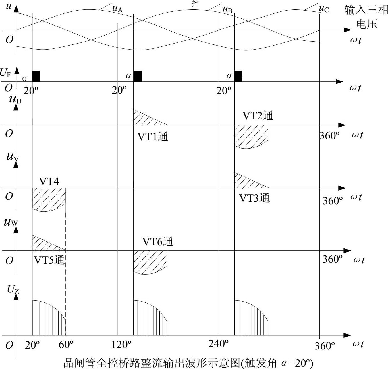 (4) 三相全控桥式整流电路特点。整流电路由6支晶闸管(VT1、VT2、VT3、VT4、VT5、VT6)组成;6支晶闸管(VT1、VT2、VT3、VT4、VT5、VT6)是否导通由其触发脉冲决定。由图2-10(d)可见,当第一个脉冲作用时,晶闸管VT1和晶闸管VT4及VT6配合导通;当第二个脉冲作用时,晶闸管VT3和晶闸管VT2及VT6配合导通;当第三个脉冲作用时,晶闸管VT5和晶闸管VT2及VT4配合导通。通过分析可知,三相全控桥式整流电路6支晶闸管(VT1、VT2、VT3、VT4、VT5、VT6)配合导通有其独特方式,导通角 θ 大小与触发角 α 有关系,导通角 θ 和触发角 α 之和为180°。