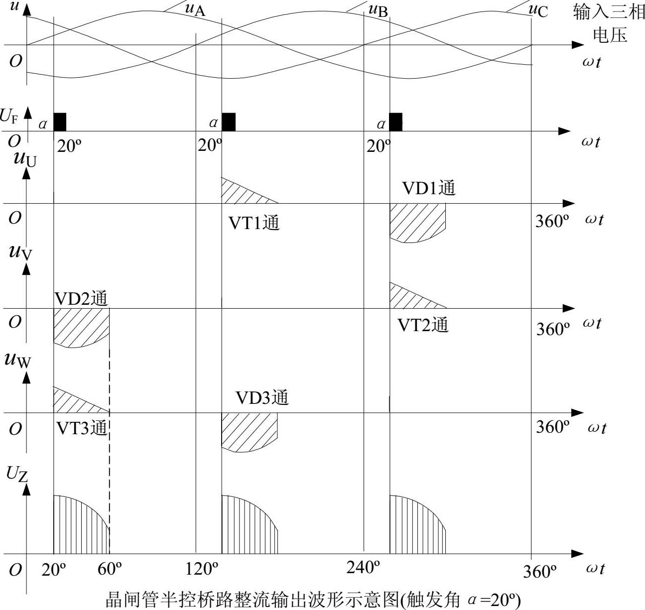(3) 三相半控桥式整流电路特点。整流电路由3支二极管(VD1、VD2、VD3)和三支晶闸管(VT1、VT2、VT3)组成。3支晶闸管(VT1、VT2、VT3)是否导通,由其触发脉冲决定。在图2-10(c)中,3支晶闸管(VT1、VT2、VT3)用相同脉冲触发,当第一个脉冲作用时,晶闸管VT1和二极管VD2及VD3配合导通,当第二个脉冲作用时,晶闸管VT2和VD1及VD3配合导通;当第三个脉冲作用时,晶闸管VT3和二极管VD1及VD2配合导通,通过分析可知,晶闸管(VT1、VT2、VT3)是和3支二极管(VD1、VD2、VD3)自动轮流配合导通;输出电压取决于晶闸管(VT1、VT2、VT3)触发角的大小。