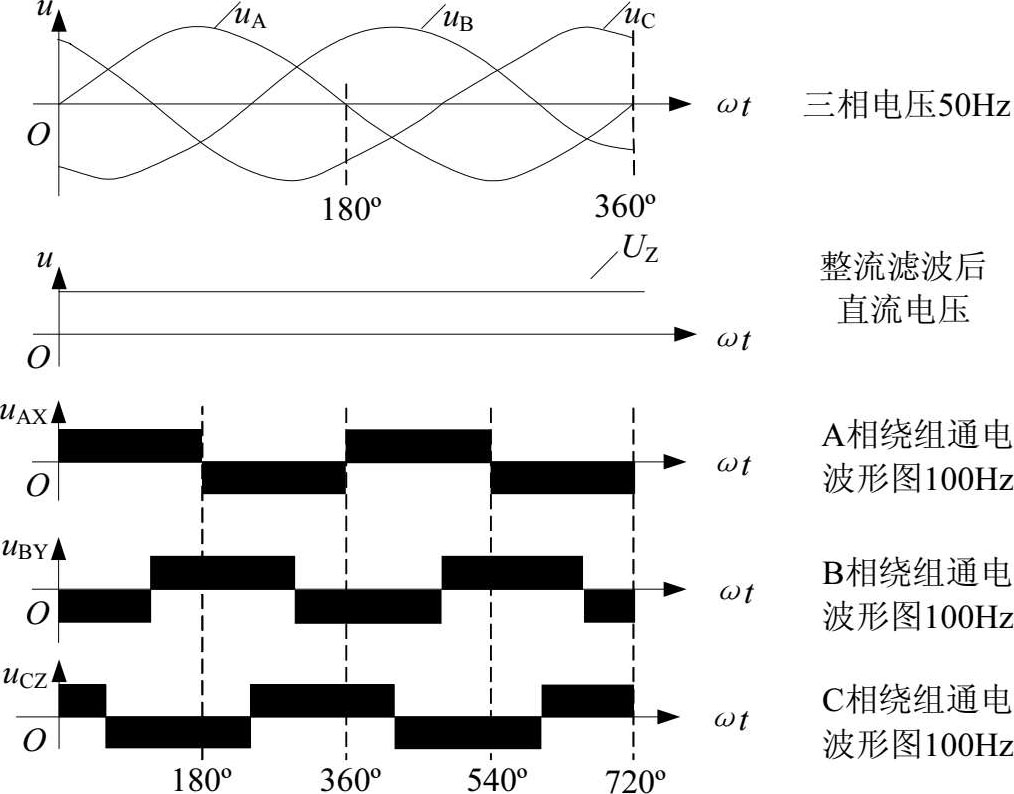 图2-27所示为用电力MOS场效应管组成的桥式逆变电路各支场效应管均导通180°电角度状态下电动机三相绕组通电波形图。由图可见,当输入三相交流电压为50 Hz时,整流后的直流电压经由场效应管逆变电路作用,得到了100 Hz的交流电压;通过改变各个场效应管栅极加电压时间的长短,得到不同频率的逆变电压。三相异步电动机在不同频率电压的作用下,转速也就不同。