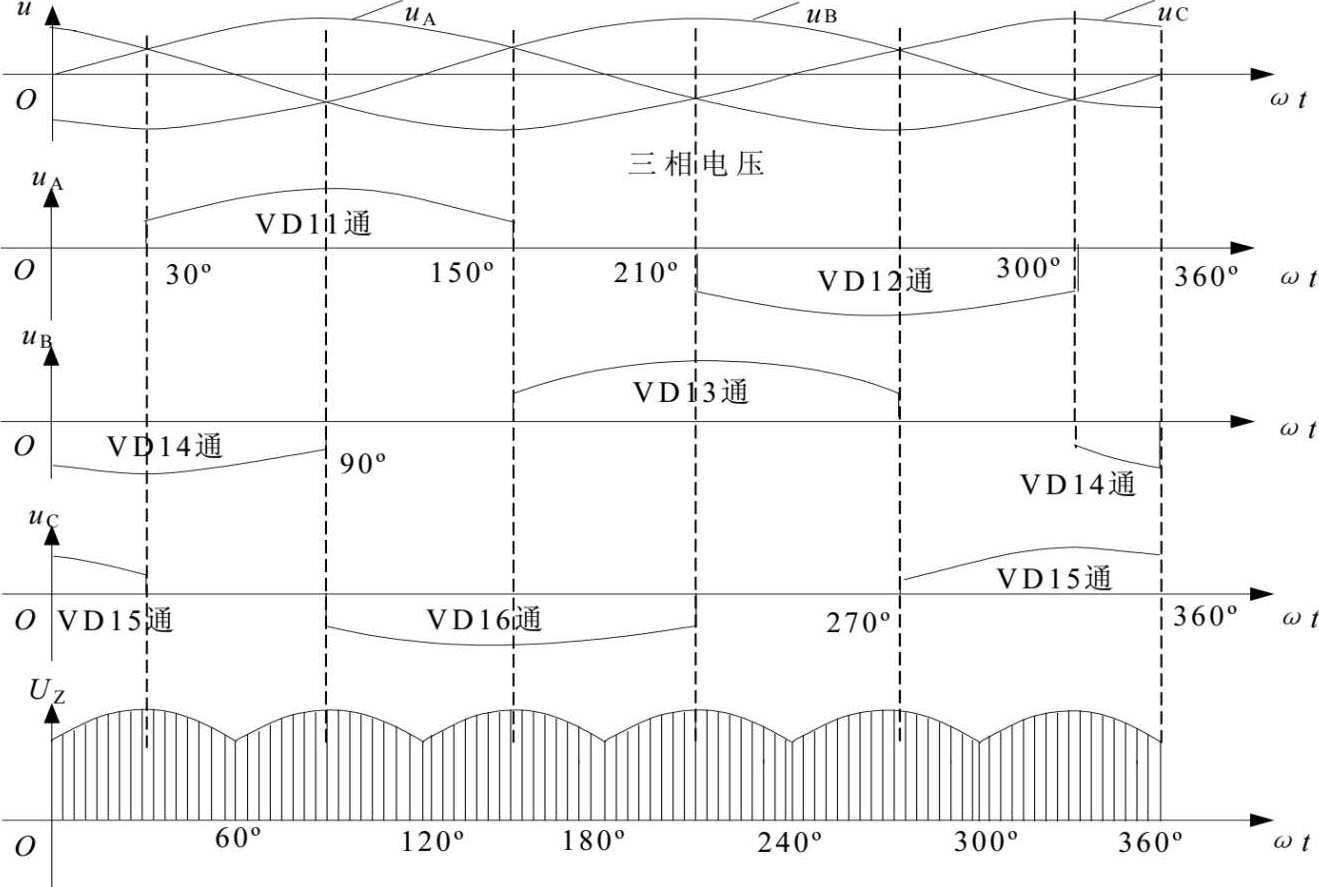 通过分析可知在每个周期内每支二极管导通180°,关断180°,需要VD1、VD2、VD3、VD4、VD5、VD6配合导通与截止。